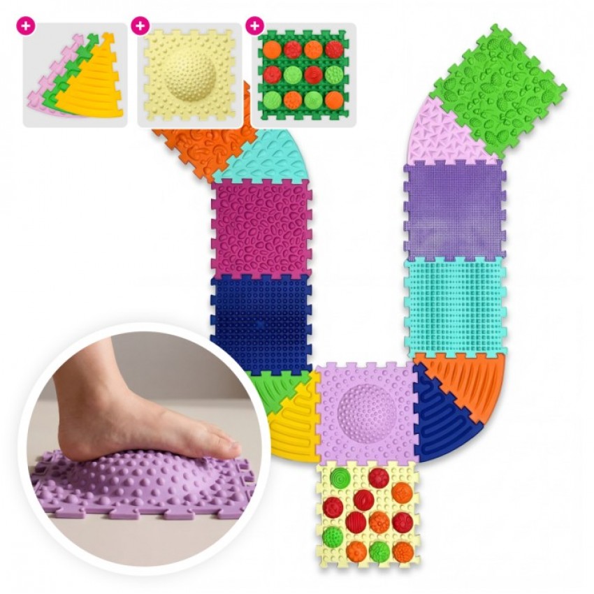 Это усиленный набор максимальной пользы, который сочетает в себе массажные пазлы, поворотные треугольники, сенсорные элементы «Узоры» и балансировочный пазл-полусферу.